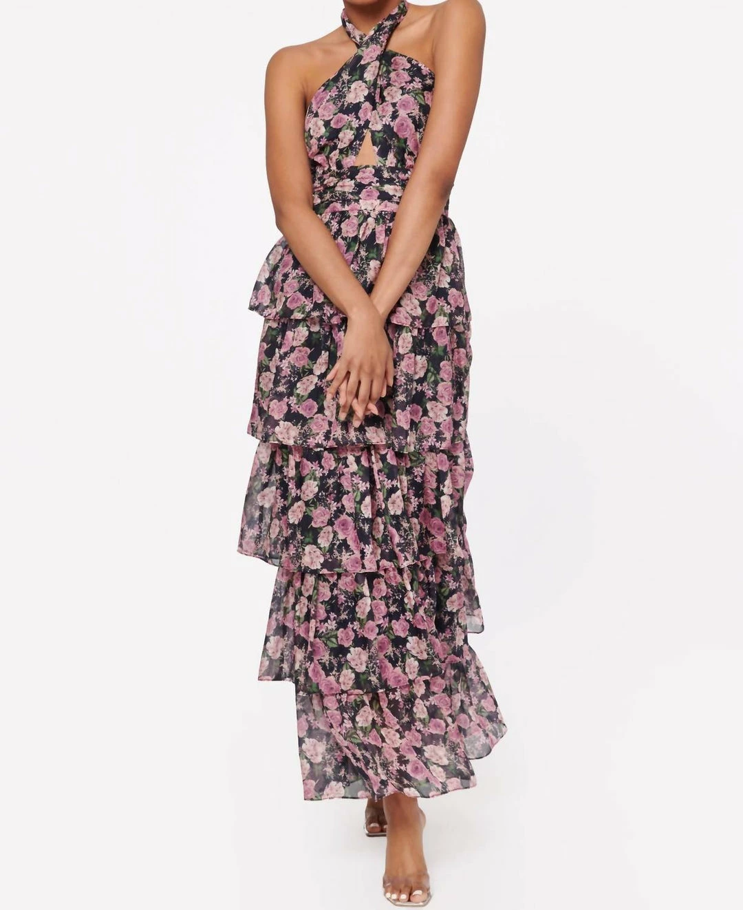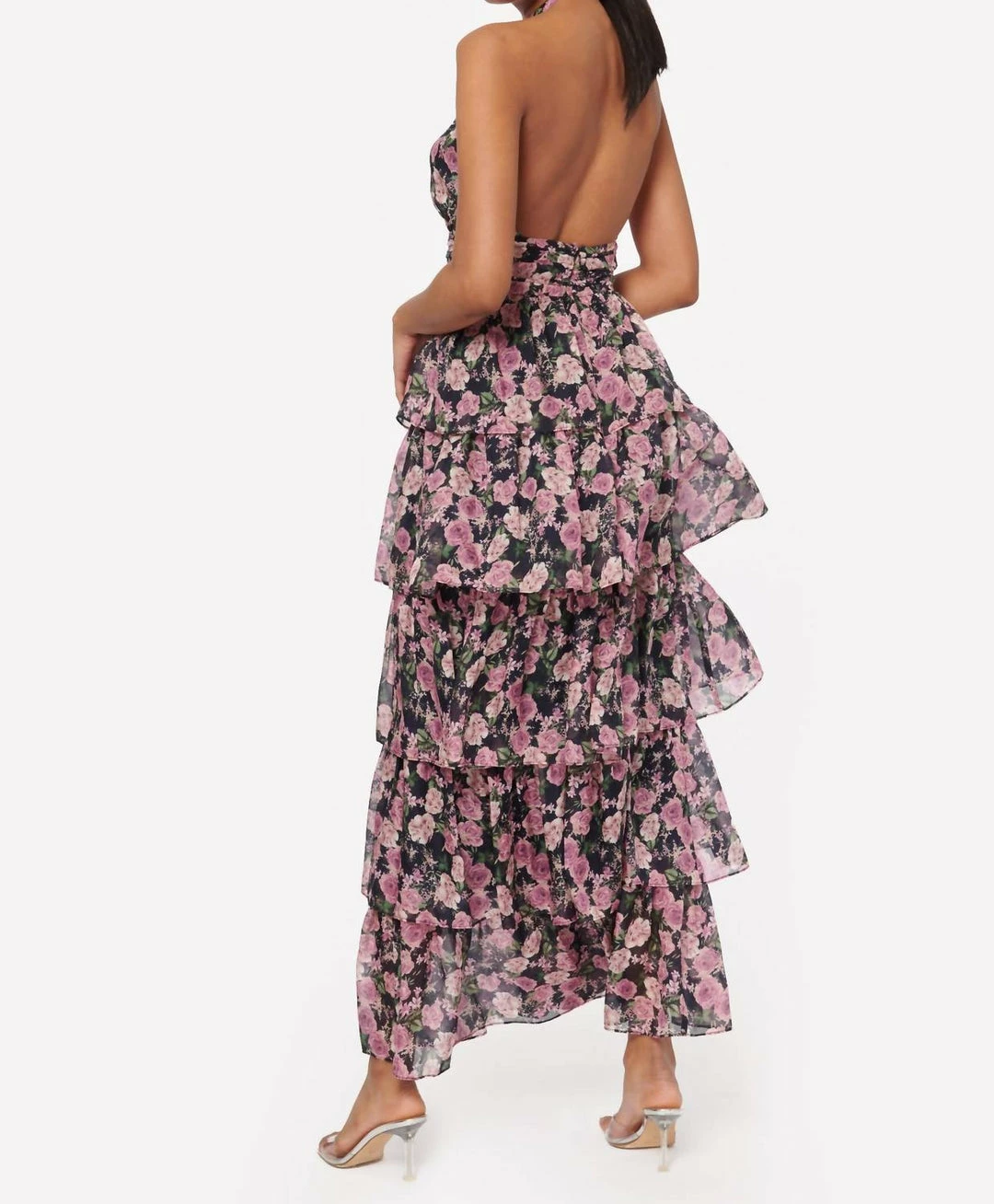 With a twist halter top, subtle keyhole detailing, and tieredΓΒ skirt, this dress has it all! Made from a silk chiffon.Runs true to sizeStyle #F22-D19-A