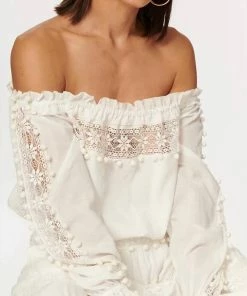Crafted from a soft cotton blend, a classic off-the-shoulder long-sleeve blouse with sheer crochet lace inserts and pom pom detailing. The Franca is finished with tunneled elastic along the top edge, bottom hem and elasticated sleeve openings.