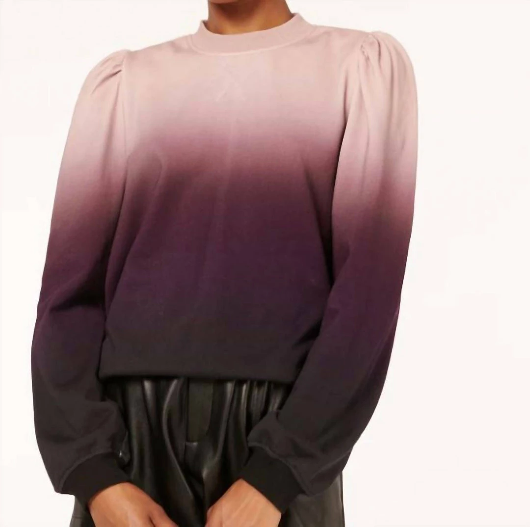 Roberta brings you comfort and ease while maintaining its role as an elevated wardrobe staple. This crewneck sweatshirt style features a puff shoulder full length sleeve with an elasticated hem. Now in our Berry Ombre, a rich and moody violet-based hue, as a light blush pink descends in to dark burgundy. Dressed up or down, this cotton style isΓΒ sure to start and complete your look.ΓΒ Γ’β¬Β’ΓΒ 100% CottonΓ’β¬Β’ Machine WashableΓΒ Γ’β¬Β’ Imported